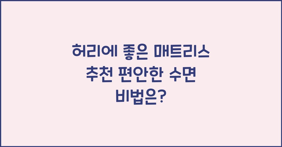 1. 허리에 좋은 매트리스, 왜 필요한가?잘못된 매트리스를 사용하면 허리에 큰 부담을 줄 수 있습니다. 사람마다 신체 구조가 다르기 때문에, 수면 중 몸을 지탱해 주는 지원력이 중요합니다. 허리에 좋은 매트리스는 올바른 수면 자세를 유지하며, 척추의 자연스러운 커브를 지켜줍니다. 이렇게 하면 허리 통증을 예방할 수 있습니다.허리에 좋은 매트리스는 일반적으로 중간 정도의 경도를 가지고 있는 것이 좋습니다. 너무 딱딱하거나 너무 부드러운 매트리스는 허리 통증을 유발할 수 있습니다. 이 때문에 허리를 지지하면서도 안락함을 동시에 제공하는 매트리스를 선택하는 것이 중요합니다. 편안한 잠자리는 몸과 심리 모두에게 긍정적인 영향을 주죠.또한, 수면 환경이 좋아지면 수면의 질도 높아집니다. 우리 몸은 충분한 휴식을 ..